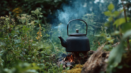 A cast iron teapot is heated by a campfire, with smoke gently rising. It is situated amongst wild plants, including some with small yellow flowers, and a fallen log. The background is a soft blur of green, suggesting a woodland or forest environment. The image captures a moment of rustic outdoor preparation.