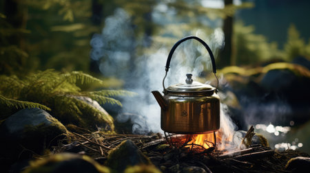Coffee Pot Over A Campfire. Generative AI illustrator