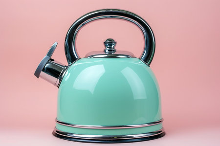 An image tailor-made for kitchenware catalogs, interior design features, or blog posts about retro home aesthetics | The photograph showcases a mint green kettle with a glossy finish that stands out against a soothing pastel pink background, invoking a sense of nostalgia and comfort. The kettle's classic design with its prominent curved handle and stout spout harkens back to a bygone era, making it a centerpiece of vintage charm in a modern kitchen setting. The chrome accents gleam with a clean, reflective quality, highlighting the kettle's pristine condition and serving as a testament to timeless design and quality craftsmanship. The precise angle of the shot captures the kettle's profile and emphasizes its smooth, rounded lines and the gentle gradient of its domed lid. The subtle shadow it casts on the surface suggests the item's stability and presence, anchoring it within the frame. The simple yet bold color contrast between the kettle and the background creates an eye-catching visual that resonates with audiences looking for a blend of functional simplicity and aesthetic appeal | Ideal for marketing campaigns by home goods retailers, as an illustrative example in articles discussing interior color trends, or as engaging visual content on social media platforms dedicated to home décor. This image would also fit seamlessly into print advertisements or as a decorative print in homes and cafes seeking a retro touch | a clean and vivid photograph of a pastel-colored kitchen kettle set against a complementary colored backdrop, offering a harmonious balance and ample negative space for editorial use or graphic text additions