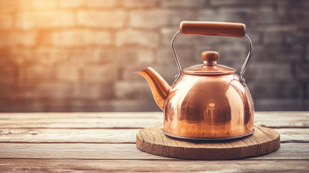 A charming copper teapot rests on a wooden surface, featuring soft lighting that enhances its reflections and warmth, perfect for cozy kitchen scenes.