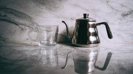 A stylish silver kettle sits next to a clear glass cup on a smooth marble surface, creating a serene ambiance perfect for enjoying brewed beverages in modern interiors.