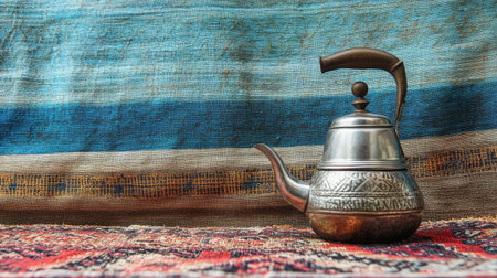 A vintage metal teapot sits gracefully on a colorful textile backdrop, showcasing rustic charm and traditional craftsmanship in a cozy setting.