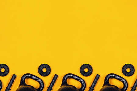 Sports background. Kettlebell and dumbbell on yellow background. Flat lay, top view, copy space.