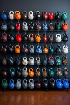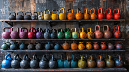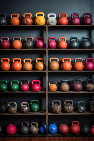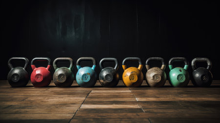 kettlebells lined up, various weights and colors, created with generative ai