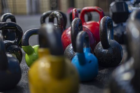 Colorful kettlebells in a row in a gym