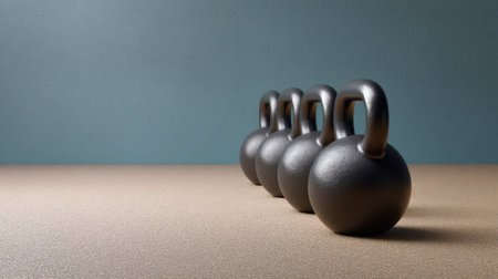 A visual composition featuring a row of black kettlebells positioned on a smooth surface against a soft blue background, ideal for fitness and exercise themes.