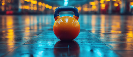 A vibrant kettlebell in the center of a polished gym floor, warm lighting, centered, wideangle shot, fitnessthemed photo