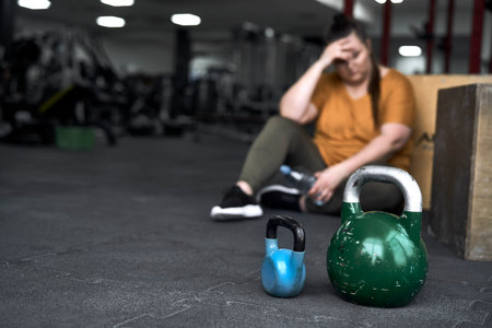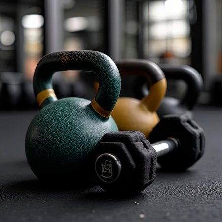 organized dumbbells and kettlebells in gym for fitness and strength training, a concept background