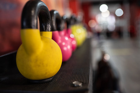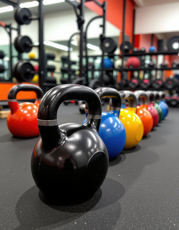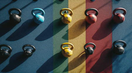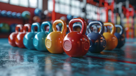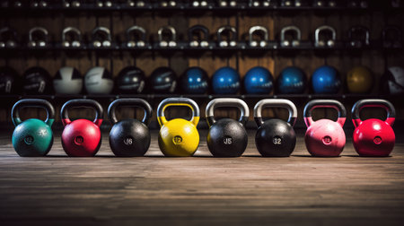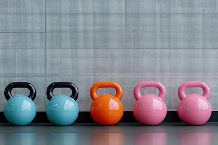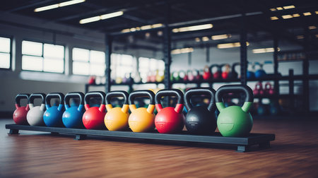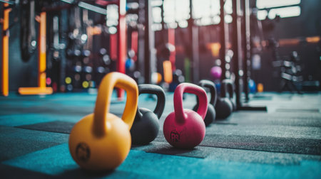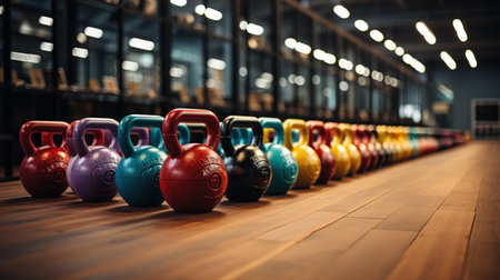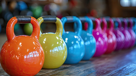 A vibrant display of kettlebells in bright colors lined up in a well-lit fitness studio during a morning workout session. Generative AI