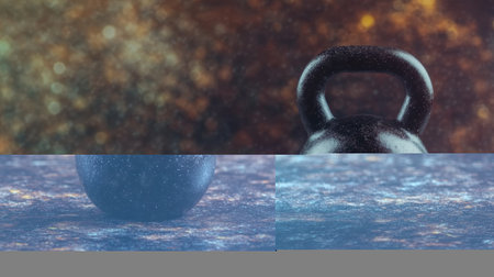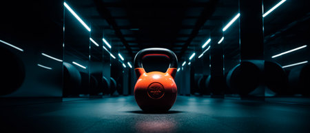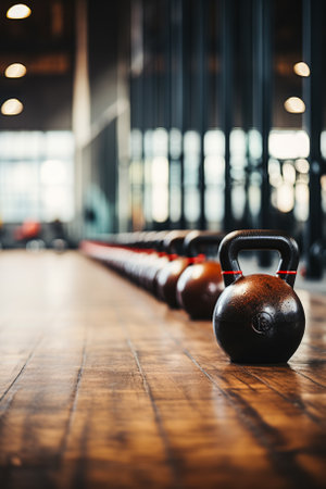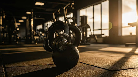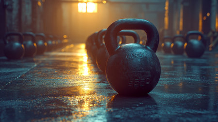 Kettlebells lined up in a dimly lit gym during sunrise, creating a serene atmosphere for morning workouts. Generative AI
