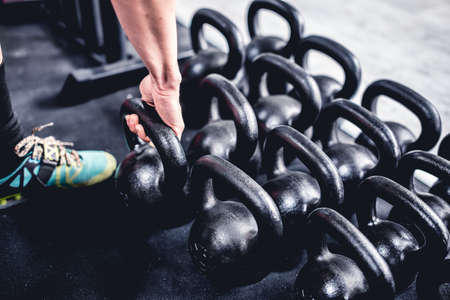 Closeup of sportswoman taking kettlebell in gym