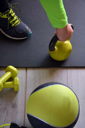 hands and legs of a young girl doing sport with a 20 kg weight