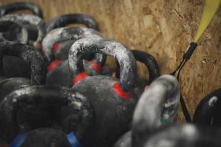 Close up view of kettlebells in a row in crossfit gym