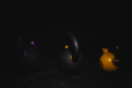 Three kettlebells in dark on black background with highlights of light on them, two black with color markings, one yellow