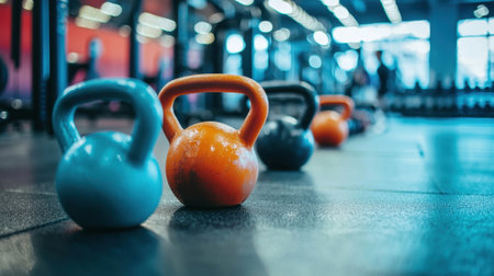 Colorful kettlebells of various weights are arranged on a gym floor. Individuals are engaged in different workout routines in the background, creating an energetic atmosphere.