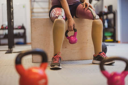 Close up of a woman with prosthetic legs exercising in the gym
