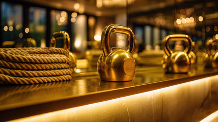 A stunning view of a golden kettlebell resting on a shelf in a chic gym, accompanied by coiled rope, illuminated by soft, warm lights, emphasizing the fitness journey's elegance.