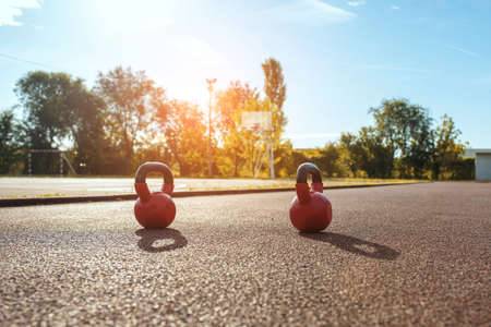two red kettlebells on a stone floor in a gym - background lighting