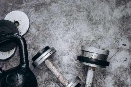 Fitness or bodybuilding concept background. Old iron dumbbells and Kettlebell on grey, conrete floor in the gym. Top view. Healthz lifestyle.