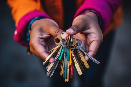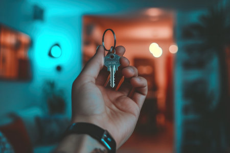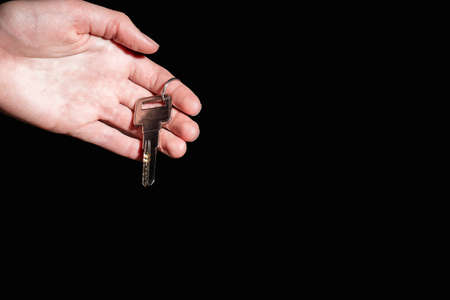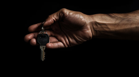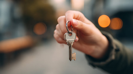 Closeup of a hand holding a key against a blurred background of a construction site. Concept Construction Site, Key Holding, Closeup Photography, Blurred Background, Hand Detail