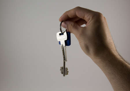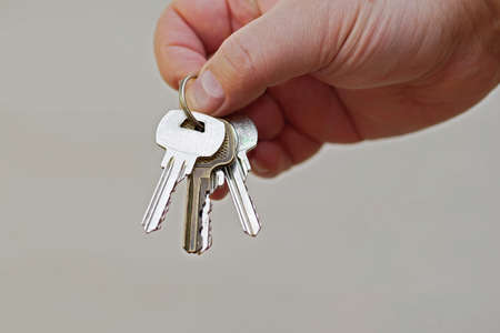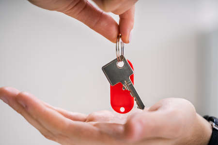 Close-up Of Hands Giving Keys Of An Apartment Against Gray Background