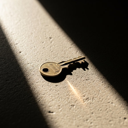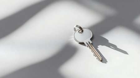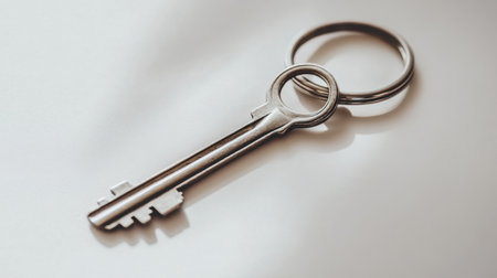 a single metal key rests on a bright surface, casting a soft shadow in a minimalist style image