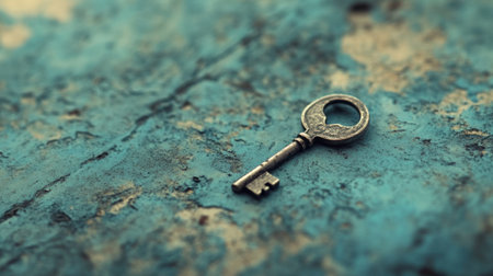 This image showcases a vintage metallic key resting on a rustic surface with a textured blue background. The intricate details highlight its timeless appeal and charm.