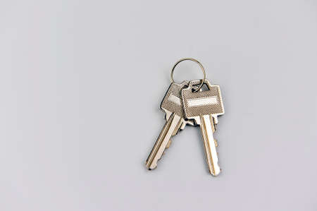 Three old keys on a ring on an abstract gray background. View from above. Space for lettering and design