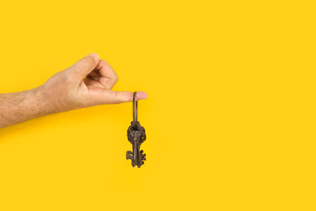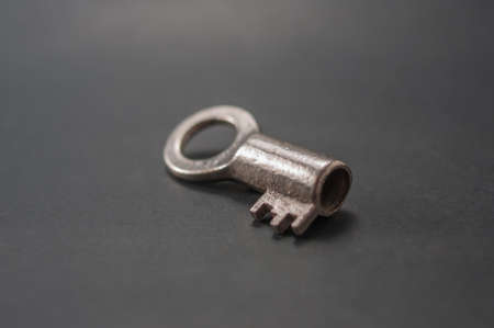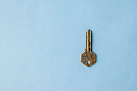Conceptual photo of old vintage and rusty metallic key on the blue background with copy space.