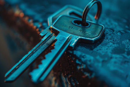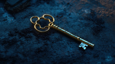 A single shiny metal key lies on a textured blue surface, showing its design and intricate details in the soft light, creating an artistic and captivating display.