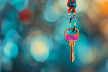 A single key dangles from a ring, showing its colorful design. The backdrop features a beautiful blur of colors, creating a dreamy atmosphere.