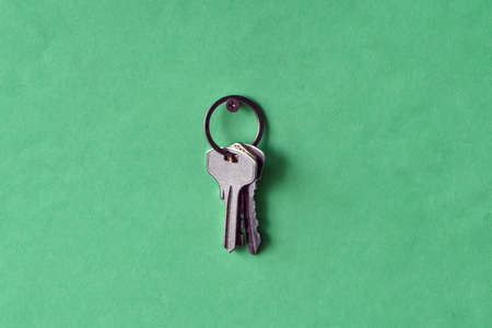 Hanging keys on the green wall, Various three keys hanging on green background.