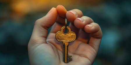 Hand Presenting a Glinting Golden Key Against Warm Backdrop.