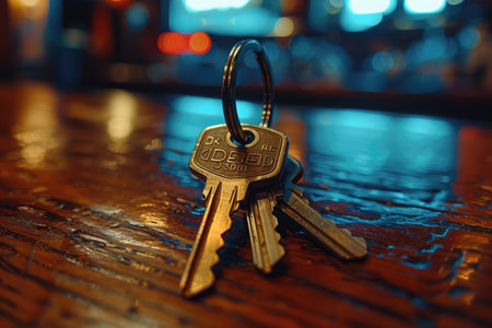 A visually stunning close-up photo of keys and a wedding ring resting on a pink background, creating a romantic and modern feel with soft shadows.