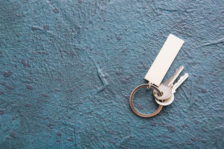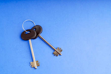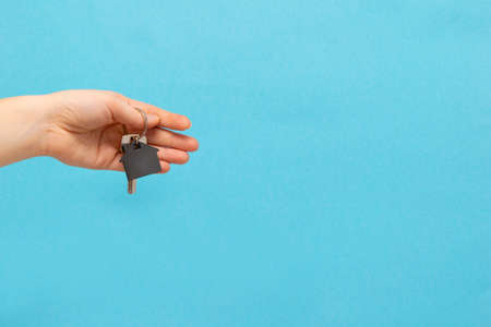 Home purchase concept. Keys with a keychain with place for text in hand on a blue background