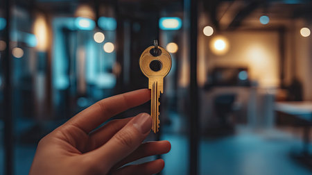 Hand holding a shiny golden key in front of a blurred office background symbolizing opportunities