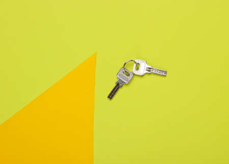Door metal keys are located in a line on a colored background. Flat lay concept.