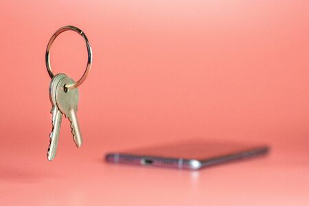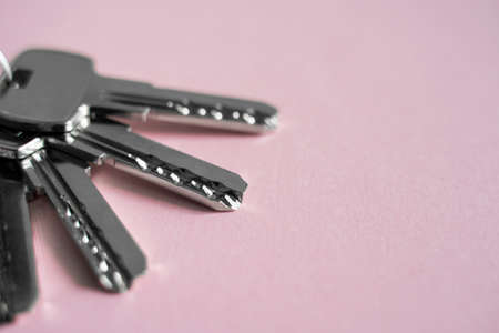 Door key lies on pink background. Set of keys. Bunch of keys. House key. New house concept. Rental and Selling.
