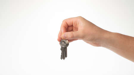 The hand holds the keys with the house keychain. Purchase of apartments.