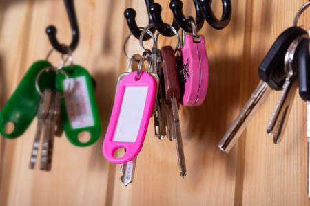 Pink keychain with copy space and keys on hooks in hallway. Wooden wall as backdrop. Many other keychains around. Low depth of field.