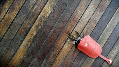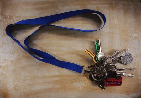 House key on the ring on table in a room. Bunch of apartment keys. To forget keys at home consept. Close-up.