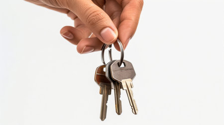 A womans hands hold a silver key with a key ring, isolated on a white background.