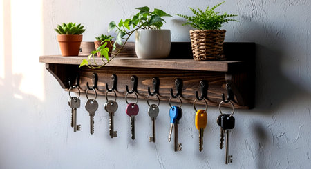 House keys hang in the hallway. The man hangs the keys back in place after just coming home.