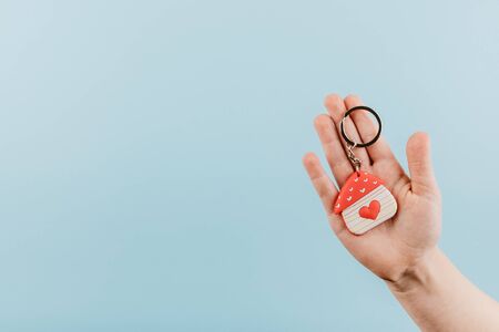 The hand holds the keys with the house keychain. Purchase of apartments.