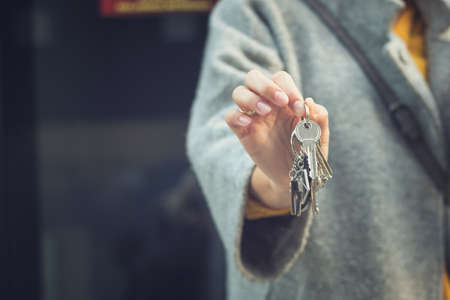 Close up of real estate agent showing keys of new apartment. Woman with new house keys.
