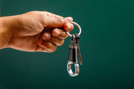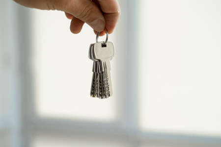 Mens hand holding a set of keys. Realtor is giving the keys to an apartment to clients. Focus on the keys. Bunch of keys in a realtors hand.