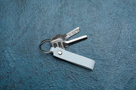 Three old keys on a ring on an abstract gray background. View from above. Space for lettering and design