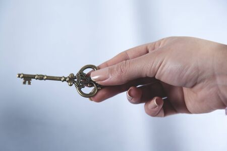 Realtor. Key to house. House key. Real estate concept. Woman holding house key. Mortgage. House key in hands. Copy space or blank space for text.