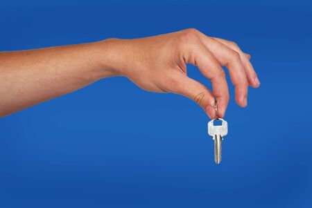 The man hand holds the keys with the house keychain on blue background. Purchase of apartments.