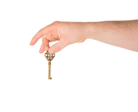 Human hand delicately holds a single ornate vintage key, symbolizing solution, access, opportunity, and unlocking potential.